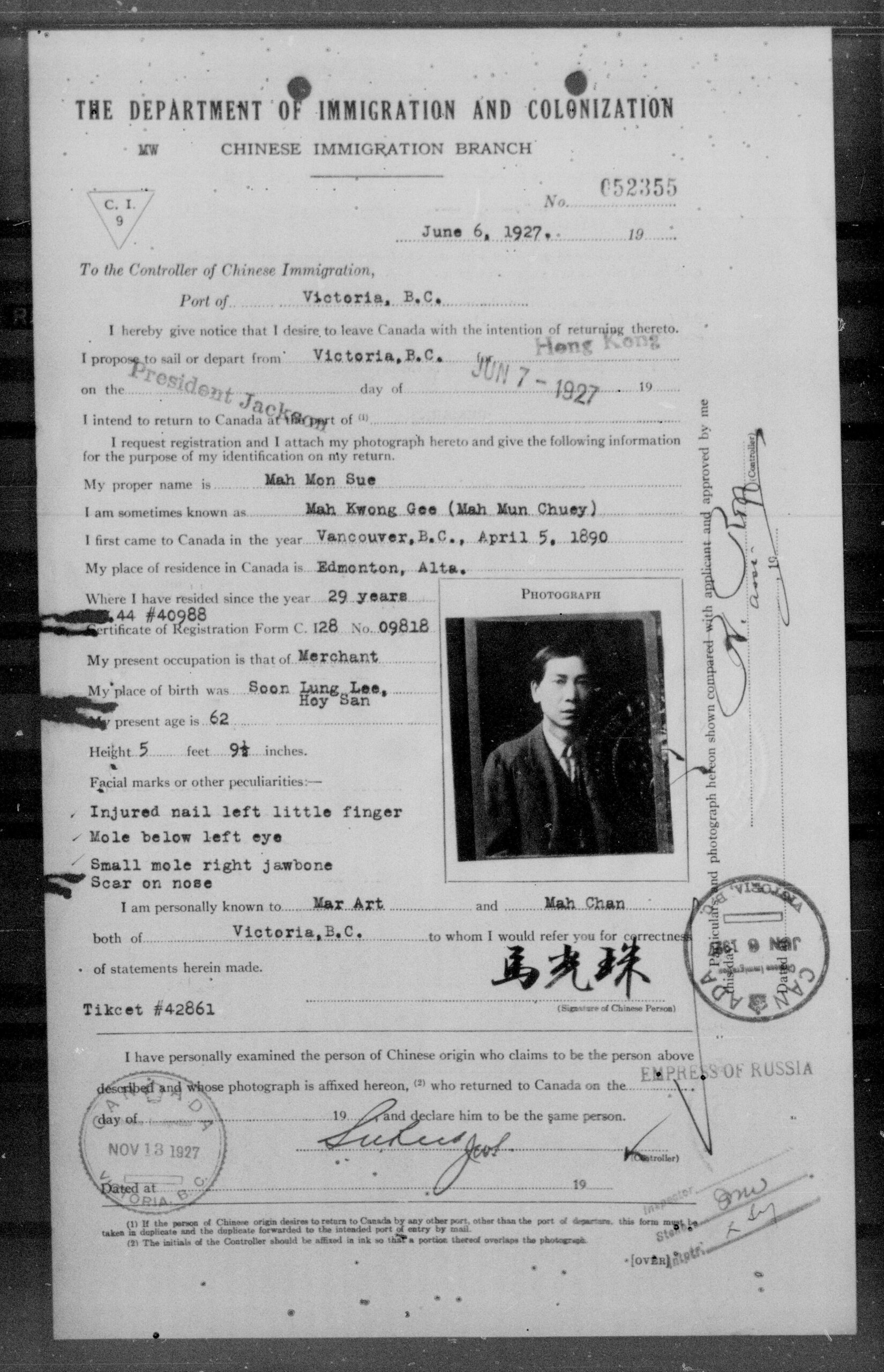 Sam Sing Mah, June 1927. This photo was part of a C.1.9 form he had to submit to the Department of Immigration and Colonization to leave Canada on a trip to China. See full certificate. Photo: Library and Archives Canada, RG 76, T-165585 https://heritage.canadiana.ca/view/oocihm.lac_reel_t16585/1660
